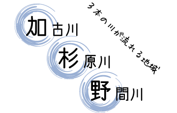 「加杉野〜かすぎの〜」 3本の川が流れる地域 私たちは西脇・多可の地を流れる 加古川(かこがわ) ・ 杉原川(すぎはらがわ) ・ 野間川(のまがわ) の頭文字を結びつけ、これらの3本の川によって地理的・歴史的に結びつきの深い この地域を「加杉野〜かすぎの〜」と名付けました。 行政区域にとらわれない大きな視点から、地域の次代のまちづくりを創造していきます。